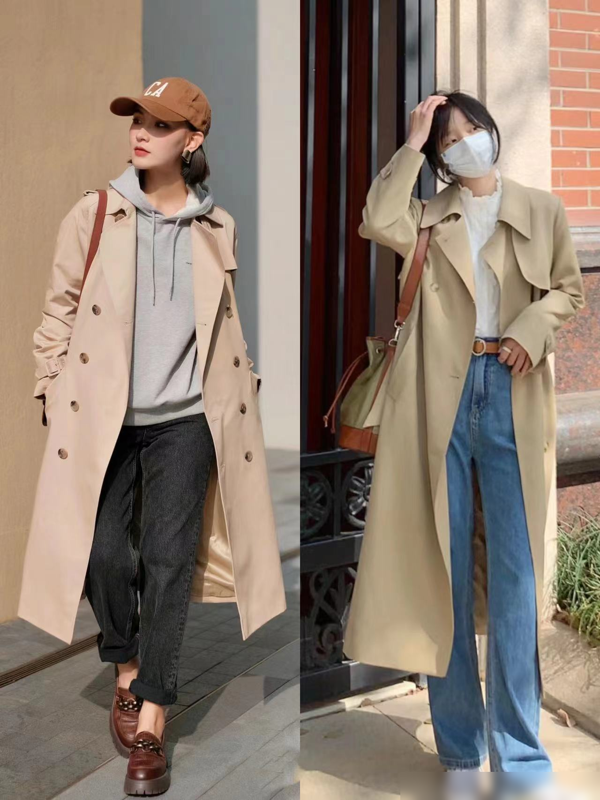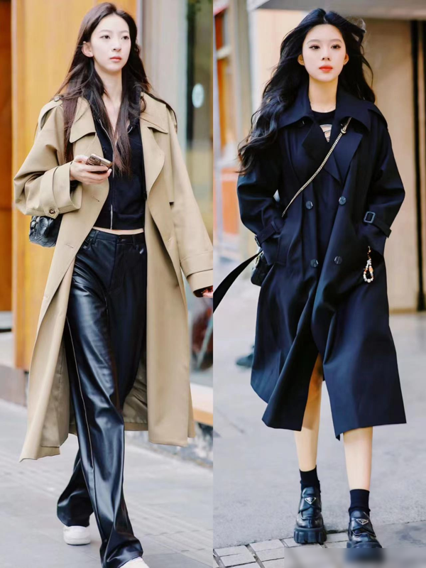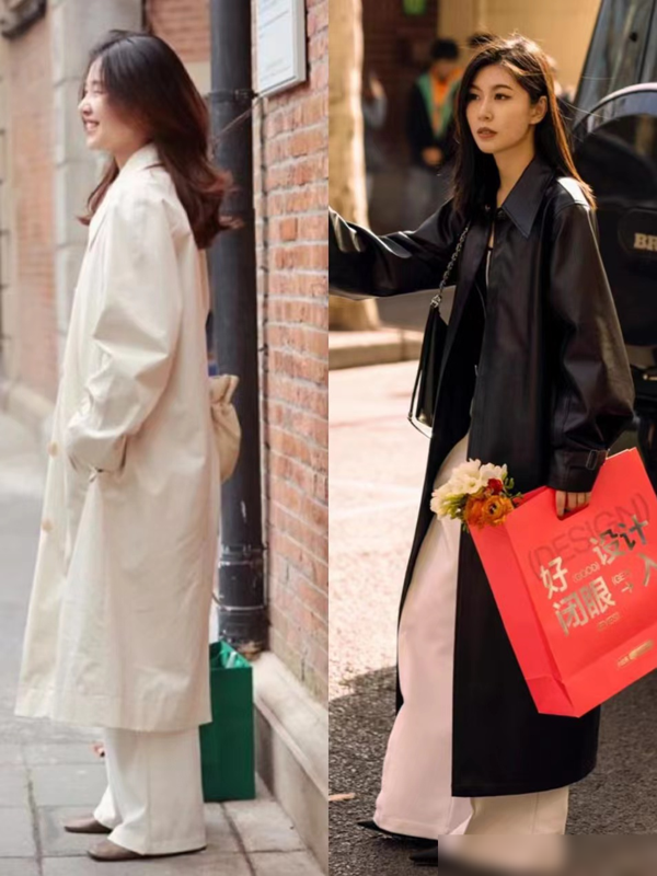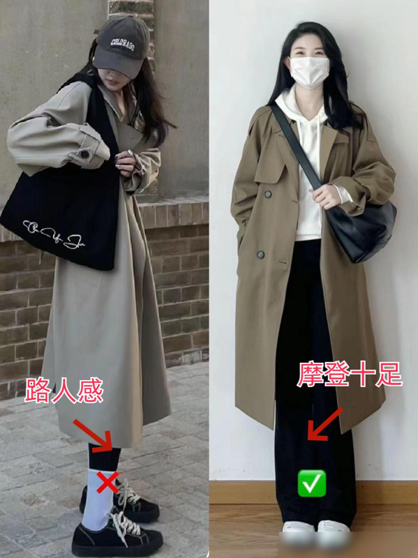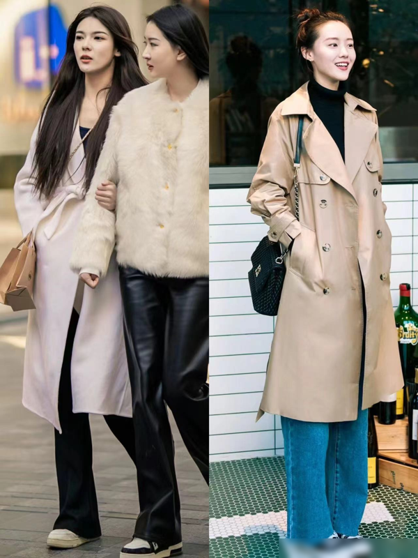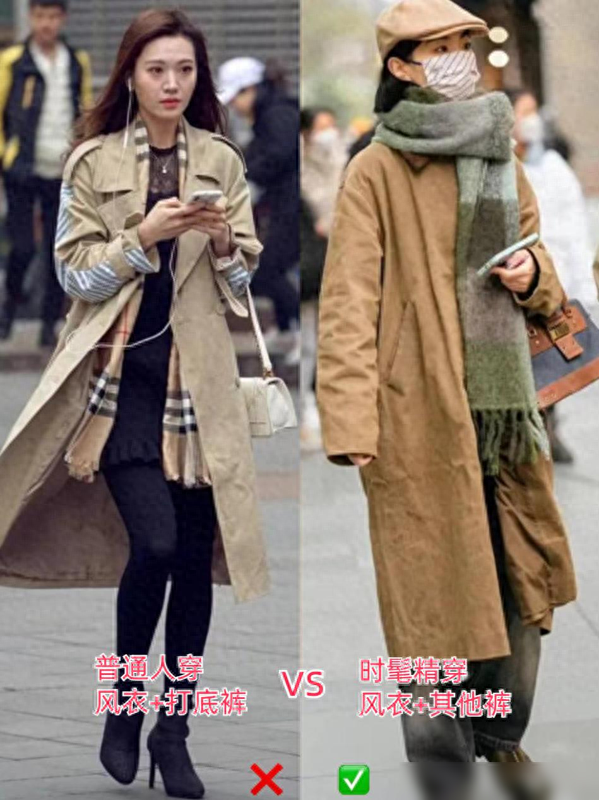 所以,建议大家在搭配风衣时,尽量避免选择打底裤,选择其他裤子更能展现女性的时尚品味。